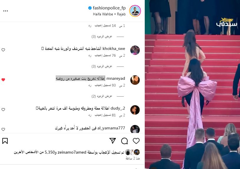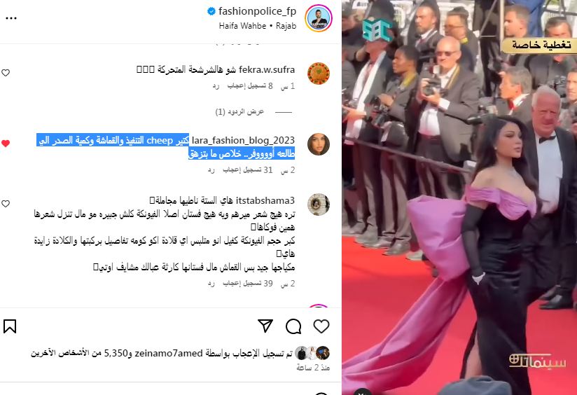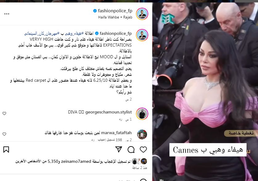 وحرص ناقد الموضة اللبناني إيلي حنا على إبداء رايه بأحدث إطلالات النجمة اللبنانية هيفاء وهبي عبر الصفحة الرسمية لشرطة الموضة بالإنستجرام، قائلا: “اطلالة هيفاء وهبي بمهرجان كان السينمائي، بصراحة كنت ناطر اطلالة هيفاء على نار و كنت حاطتVERYY HIGH EXPECTATIONS لاطلالتها و متوقع شي كتير قوي".
