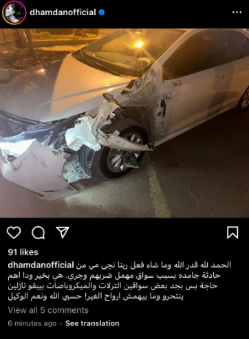 ونشرت ميس حمدان، صورة لسيارة شقيقتها مي وهي محطمة، وعلقت عليها قائلة: "الحمد لله قدر الله وما شاء فعل، ربنا نجى مي من حادثة جامدة بسبب سواق مهمل، ضربهم وجري، هي بخير ودا أهم حاجة، بس بعض سواقين التريلات والميكروباصات بيبقوا نازلين ينتحروا، ومبيهمش أرواح الغير، حسبي الله ونعم الوكيل ".