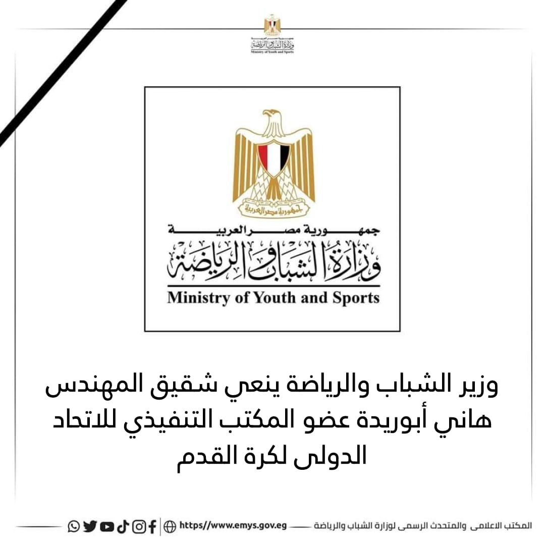 تقدم الدكتور أشرف صبحي وزير الشباب والرياضة بخالص التعازي للمهندس هاني أبوريدة، رئيس اتحاد الكرة الأسبق وعضو اللجنة التنفيذية للاتحاد الدولي لكرة القدم "فيفا" والاتحاد الإفريقي لكرة القدم "الكاف في وفاة المغفور له بإذن الله شقيقه المهندس عصام أبوريدة، داعين المولى - عز وجل - أن يتغمد الفقيد بواسع رحمته، ويدخله فسيح جناته، ويلهم الأسرة الكريمة الصبر والسلوان.