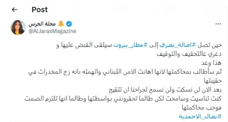 وأضافت "الأحمدية" في منشورها: " سأطالب بمحاكمتها لأنها أهانت الأمن اللبناني واتهمته بأنه زج المخدرات في حقيبتها، بعد الآن لن نسكت ولن نسمح لجراحنا أن تتقيح، كنت تناسيت وسامحت لكن طالما تحقرونني بواسطتها وطالما انها تلتزم الصمت فوجب محاكمتها ".