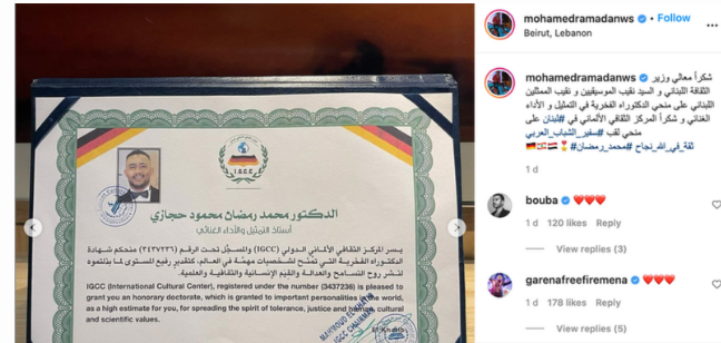 في أغسطس 2021، وجّه "رمضان ر" سالة شكر لوزير الثقافة اللبناني ونقيب الموسيقيين والممثلين اللبناني على تكريمه ومنحه دكتوراة الفخرية ولقب سفير الشباب العربي بحسب ما ورد في منشور عبر صفحته "فيسبوك"، لكن سرعان ما تبرأت نقابة الممثلين في لبنان من هذه الأخبار، مؤكدة أنها لم تشارك في هذا التكريم، وأنها ليست الجهة المخولة بمنح ألقاب سفراء أو غيرها من الألقاب.