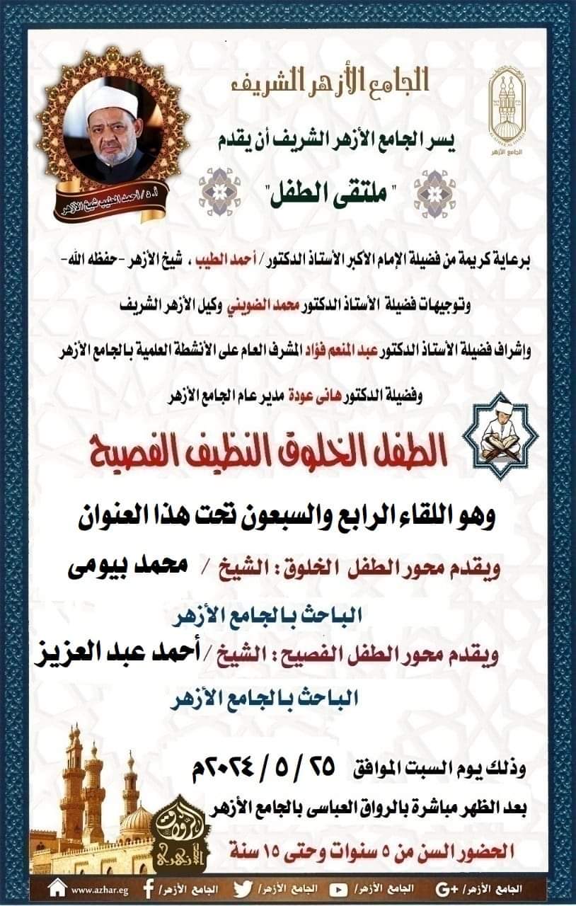 يذكر أن ملتقى " الطفل الخلوق والنظيف والفصيح" يعقد يوم السبت من كل أسبوع بالجامع الأزهر، ويتم تنفيذه في بعض المحافظات ، وذلك لتربية النشء على أسس صحيحة، وفهم عميق لأخلاقيات ديننا الحنيف.
