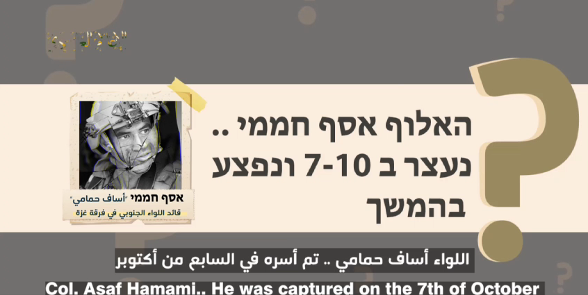 وأشار الفيديو إلى الأسير إساف حمامي قائد اللواء الجنوب في فرقة غزة، الذي تم أسره يوم 7 أكتوبر 2023، وتعرض للإصابة أثناء اعتقاله، وتركت المقاومة التخمينات مفتوحة حول مصير الأسير الإسرائيلي.