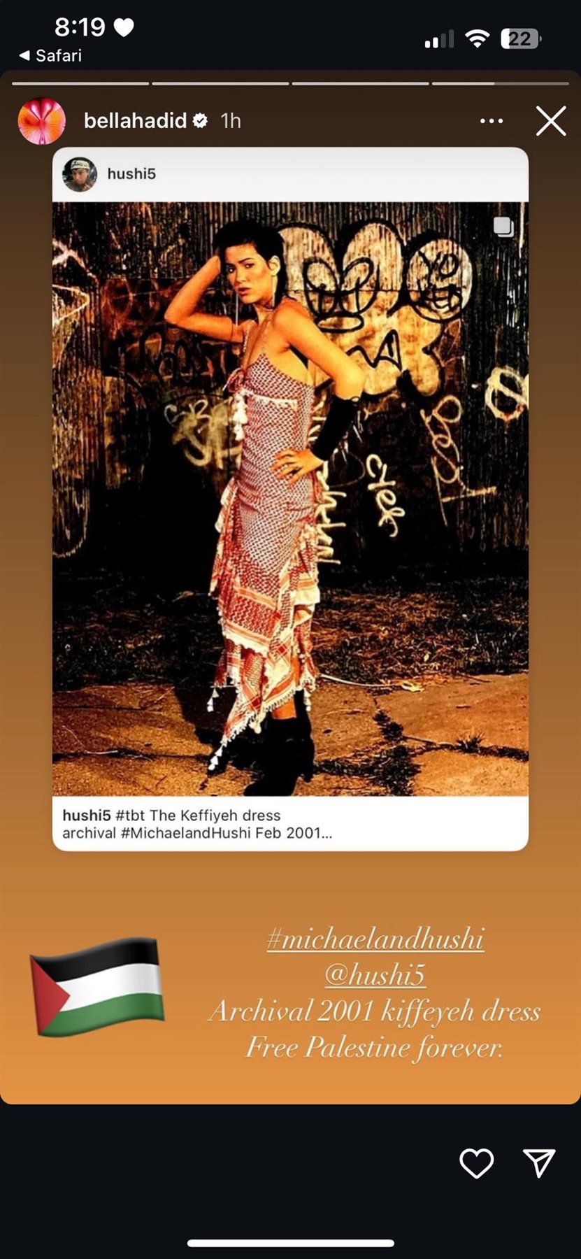 ونشرت بيلا حديد عبر خاصة “استوري” على حسابها الرسمي على إنستجرام تفاصيل إطلالتها المميزة وعلقت على الصورة قائلة :" من أرشيف 2001، فلسطين حرة للأبد