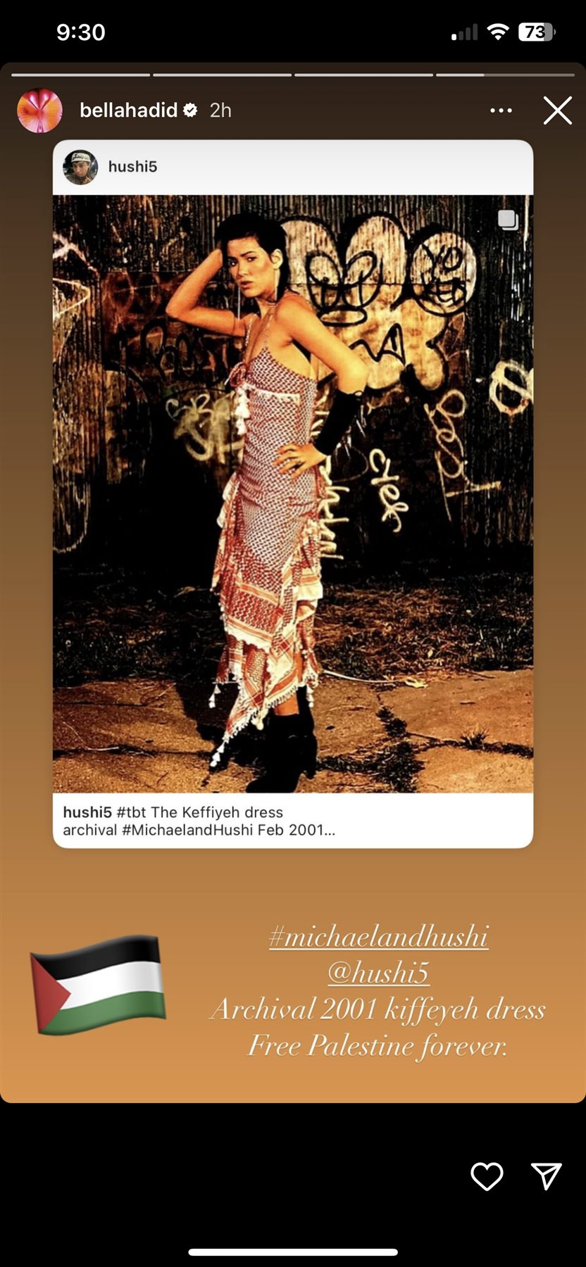 إلا أن بيلا حديد قطعت الشك باليقين وأكدت عبر الحالة الخاصة بها علي حسابها الشخصي بموقع تبادل الصور والفيديوهات انستجرام، أنها ارتدت الفستان دعمًا لفلسطين.