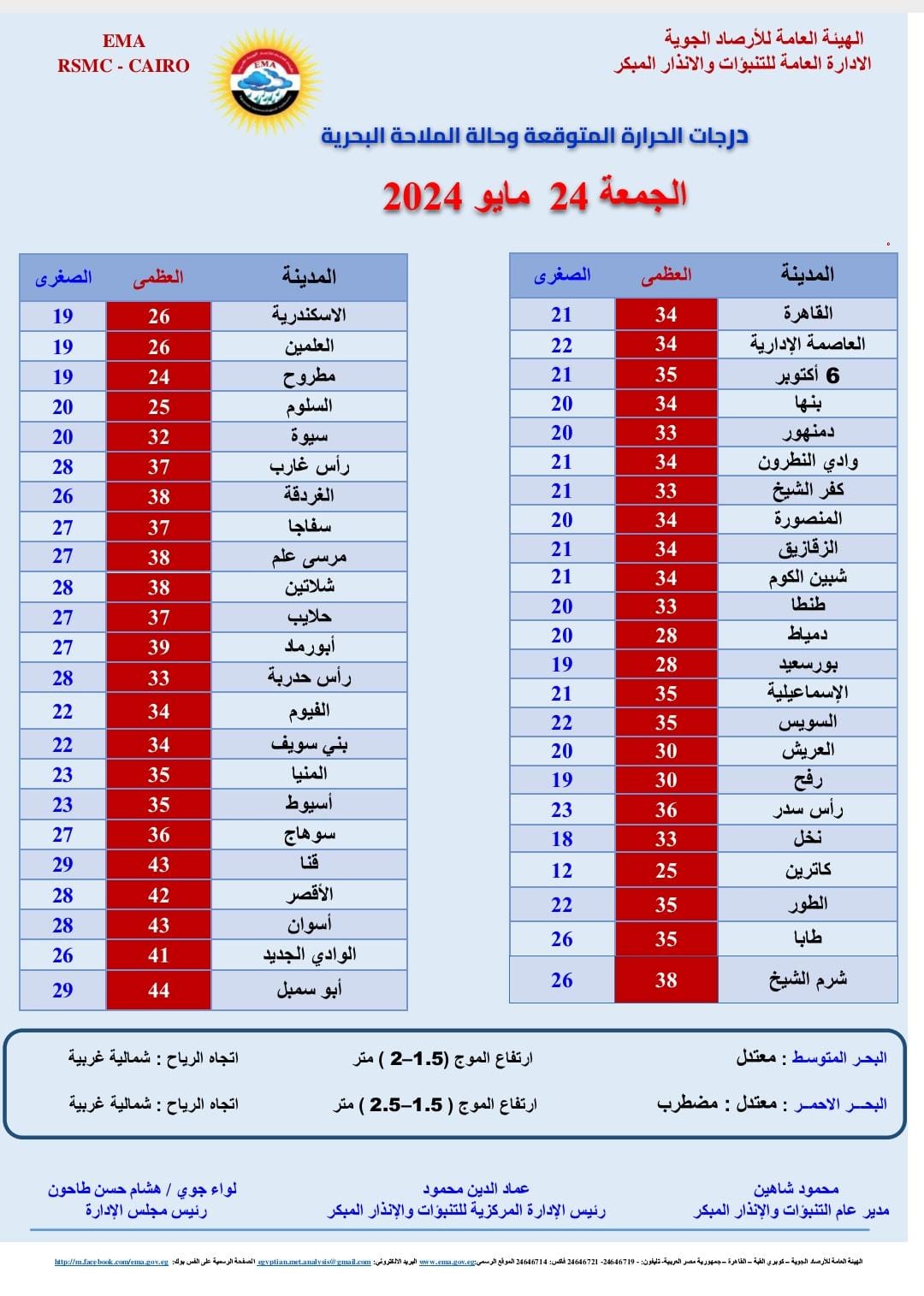 بعد إعلان الهيئة العامة للأرصاد الجوية عن انخفاض درجات الحرارة اليوم وانكسار الموجة شديدة الحرارة التي ضربت البلاد الأسبوع المنصرم، نرصد درجات الحرارة الصغرى والعظمى متوقعة في عدد من المدن والمحافظات اليوم الجمعة الموافق 24 مايو.