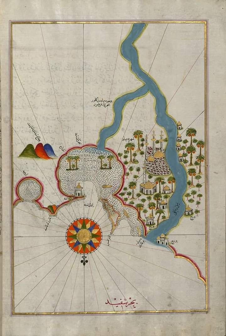 فظهرت خريطة عثمانية، لمصب فرع دمياط للرسام والجغرافي العثماني أحمد محي الدين بيري، “ بيري ريس 1470:1555”.
