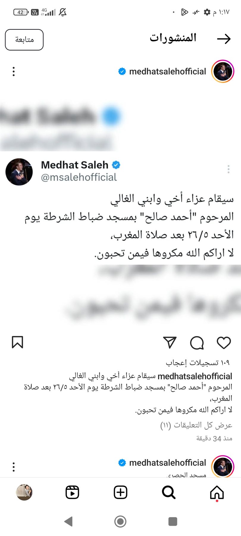 يستقبل المطرب مدحت صالح، عزاء شقيقه أحمد، بمسجد ضباط الشرطة، وذلك يوم الأحد المقبل بعد صلاة المغرب.
