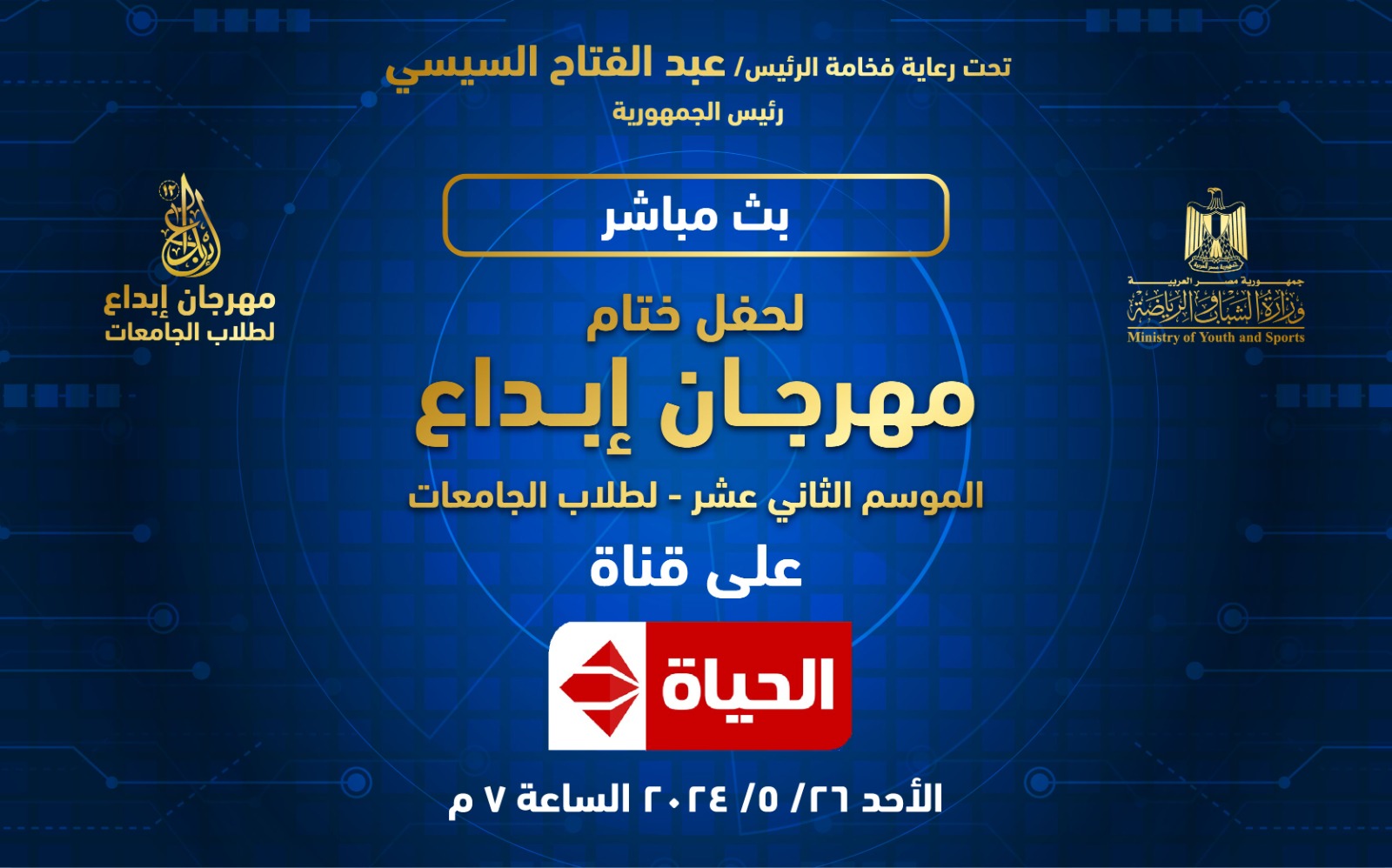 أعلنت وزارة الشباب والرياضة عن إقامة حفل ختام مهرجان  إبداع - الموسم الثاني عشر 2024 لطلاب الجامعات،  والذي تم تنفيذه تحت رعاية  الرئيس عبدالفتاح السيسي رئيس الجمهورية، ويتم بث الحفل مباشرة علي قناة الحياة، وذلك يوم الأحد الموافق ٢٦ مايو الجاري.