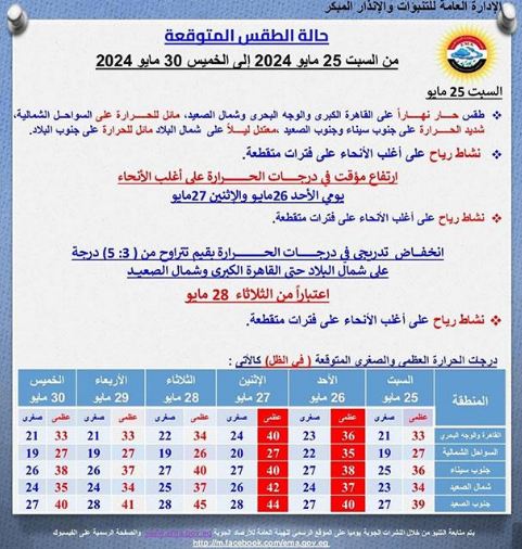 وأوضحت هيئة الأرصاد الجوية أنه من المتوقع أن تشهد كل الأنحاء ارتفاعًا مؤقتًا في درجات الحرارة على أغلب الأنحاء غدًا الأحد الموافق 26 مايو والإثنين الموافق 27 مايو، كما تنشط الرياح على أغلب الأنحاء على فترات متقطعة.