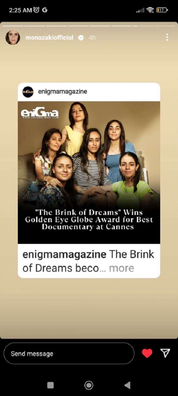 شاركت منى زكي جمهورها ومحبيها، صورة لأبطال فيلم رفعت عيني للسما بعد فوز الفيلم بالجائزة، وذلك خلال استوري عبر حسابها الرسمي على موقع تبادل الصور والفيديوهات "إنستجرام".