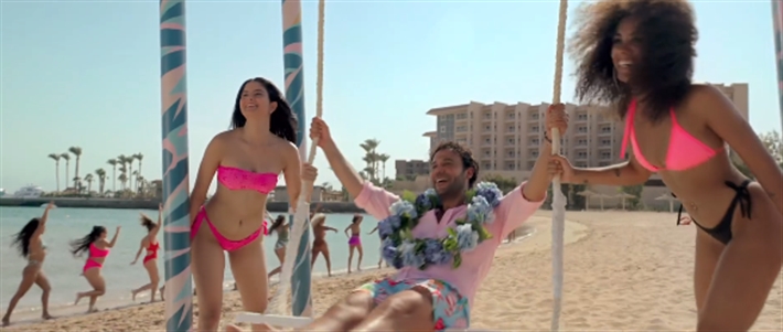 ظهر محمد إمام في بداية البرومو التشويقي للفيلم وهو يرقص في وسط مجموعة فتيات على الشاطئ وينتهي الإعلان بحفل زفافه على ويزو، التي تسقط عليه بفستان الزفاف، ويقع صارخا.