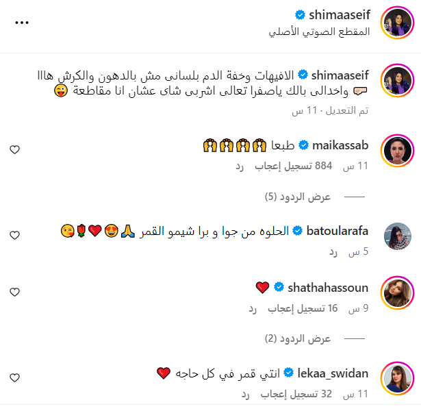 وجاءت التعليقات كالآتي: "عسل وقمر بكل حالاتك، الحلوه من جوا ومن بره، طبعًا، شيمو انتي روحك قمر".