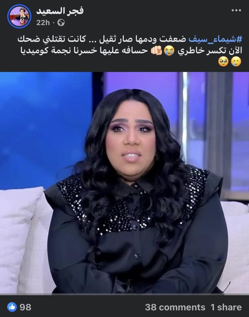 نشرت فجر السعيد صورة شيماء سيف من أحدث ظهور لها بعد فقدانها للوزن، خلال لقائها مع الإعلامي ياسمين عز ببرنامج "كلام الناس"، وأرفقتها بتعليق قائلة: "شيماء سيف ضعفت.. كانت تقتلني ضحك الآن تكسر خاطري .. حسافه عليها خسرنا نجمة كوميديا"، مما أثار غضب شيماء ودفعها للرد بطريقتها الخاصة.