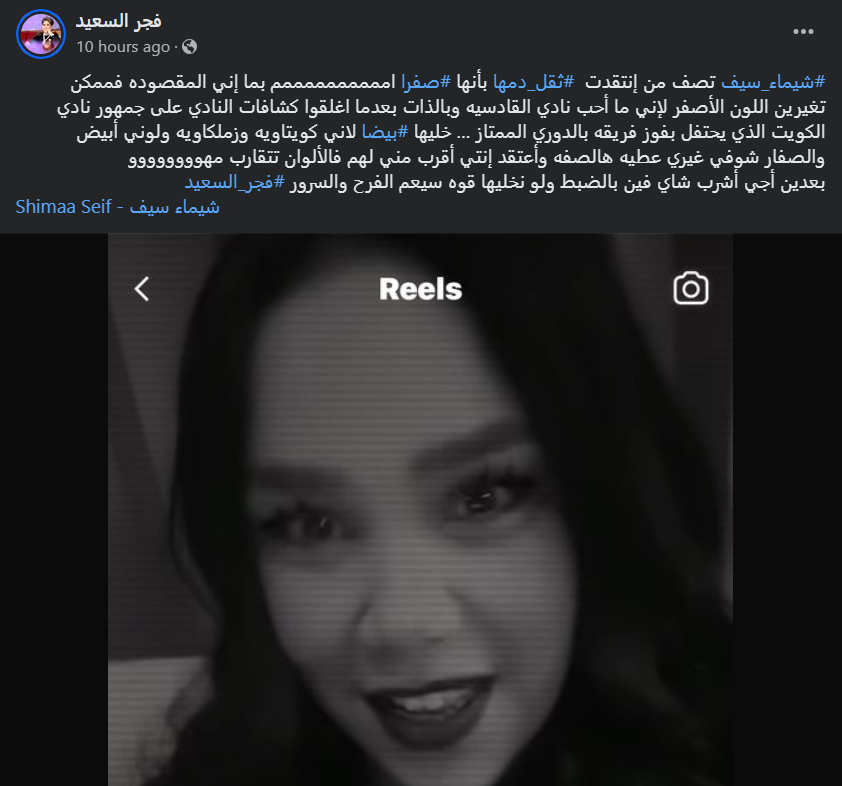 وأضافت فجر: "بما إني المقصودة فممكن تغيرين اللون الأصفر لإني ما أحب نادي القادسية وبالذات بعدما أغلقوا كشافات النادي على جمهور نادي الكويت الذي يحتفل بفوز فريقه بالدوري الممتاز … خليها بيضا لأني كويتاوية وزملكاوية ولوني أبيض".