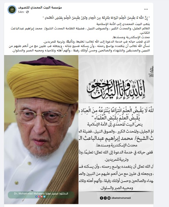 ينعى البيت المحمدي إلى الأمة الإسلامية، العالم الجليل، والمحدث الكبير ، والصوفي النبيل ، فضيلة العلامة المحدث الشيخ/ محمد إبراهيم عبد الباعث الكتاني، محدث الإسكندرية ومسندها، الذي قضى حياته في خدمة الدعوة إلى الله تعالى؛ تعليمًا، وتأليفًا، وتربية للمريدين.