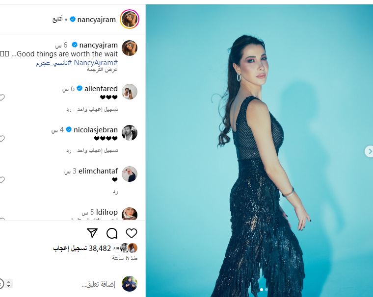 وبدت نانسي عجرم في أحدث ظهور لها بنشر صورها عبر الإنستجرام، حيث ارتدت جمبسوت مجسم، محدد الخصر، صمم من قماش الشبيكة باللون الأسود، عكس قوامها الممشوق ووزنها المثالي.