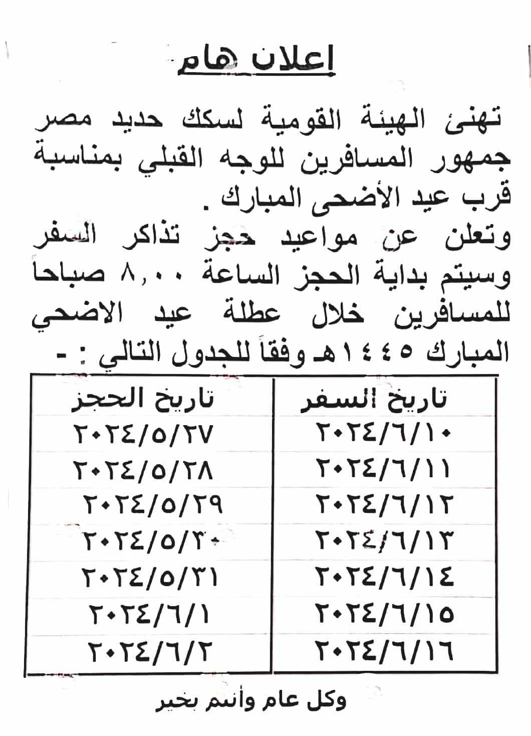 أعلنت الهيئة القومية لسكك حديد مصر، عن بدء حجز قطارات عيد الأضحى المبارك اليوم الإثنين، كما أكدت تشغيل عدد كبير من القطارات الإضافية بمناسبة عيد الأضحى المبارك، علاوة على القطارات الحالية خلال الفترة من 10 / 6 / 2024 إلى 28 /6 / 2024 وذلك تيسيراً على جمهور الركاب وراحتهم.