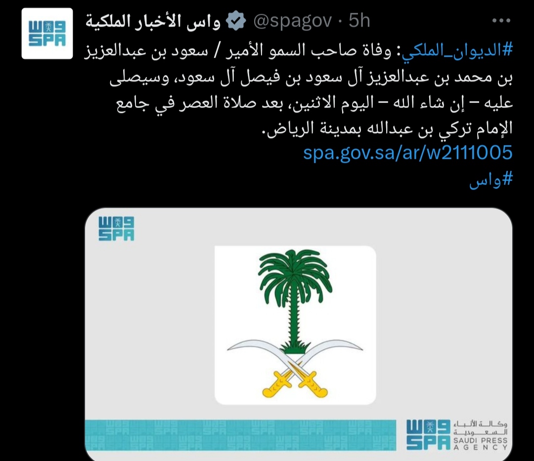 وكان الديوان الملكي السعودي أصدر اليوم الاثنين البيان التالي: " انتقل إلى رحمة الله تعالى صاحب السمو الأمير سعود بن عبدالعزيز بن محمد بن عبدالعزيز آل سعود بن فيصل آل سعود، وسيصلى عليه اليوم الاثنين الموافق 19 / 11 / 1445هـ، بعد صلاة العصر في جامع الإمام تركي بن عبدالله في مدينة الرياض..تغمده الله بواسع رحمته ومغفرته ورضوانه وأسكنه فسيح جناته، إنا لله وإنا إليه راجعون".