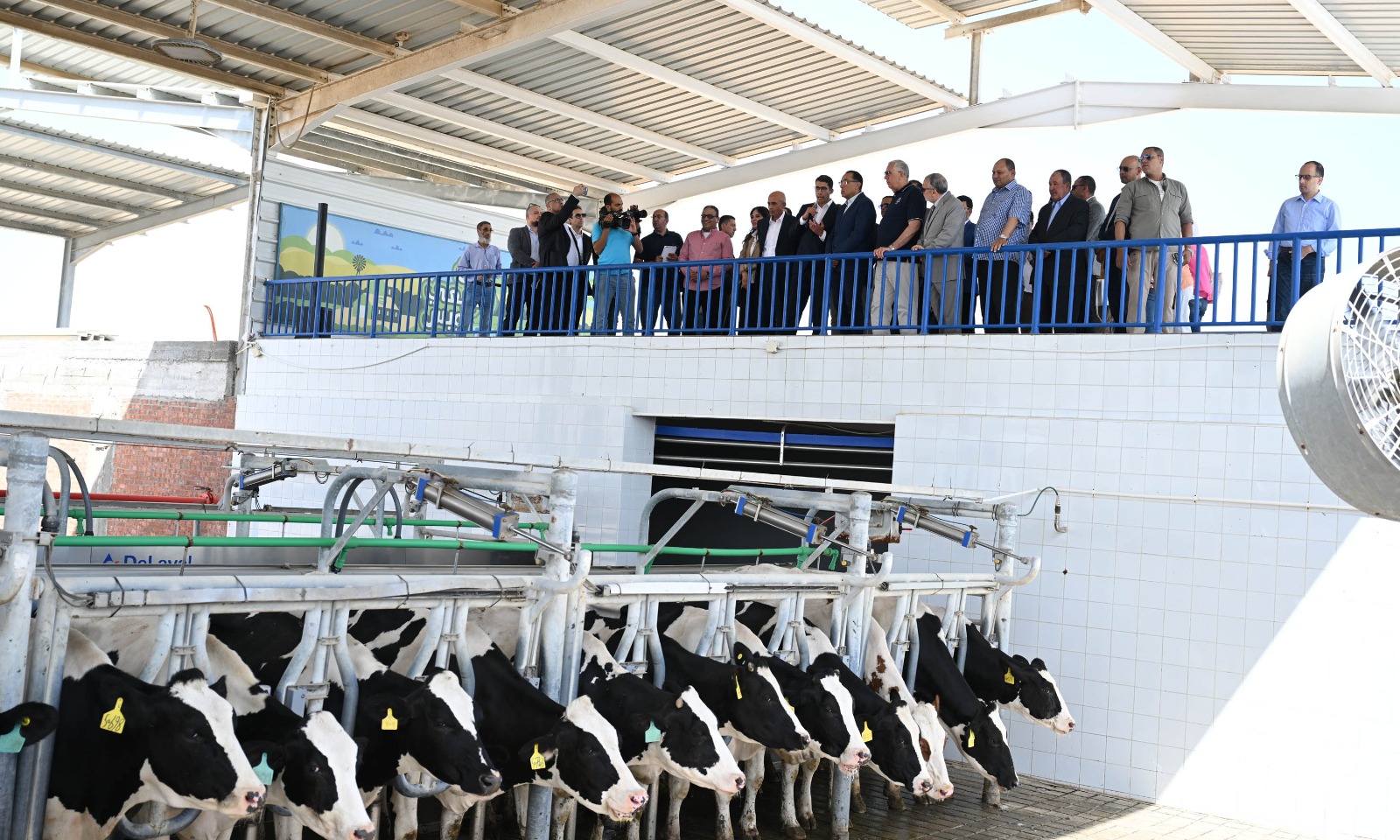 أوضح رئيس الشركة أنه تم إقامة مزرعة الشركة، التي يتم تفقدها اليوم، على مساحة إجمالية تبلغ 2700 فدان تقع في منطقة غرب النوبارية على ترعة النصر مباشرة من مدخل الكيلو 75 طريق إسكندرية القاهرة الصحراوي؛ حيث يتم استخدام أساليب الري الحديثة في الزراعة، وتنقسم الزراعات بها إلى شقين: أشجار فاكهة، ومحاصيل أعلاف لتربية الإنتاج الحيواني متمثلة في محصوليْ البرسيم والذرة، مضيفا أنه تم كذلك إنشاء محطة إنتاج حيواني على مساحة 150 فدانا تضم 57 عنبرا؛ حيث تصل الطاقة الإجمالية للانتاج الحيواني إلى 17 ألف رأس، ويتوافر بالمزرعة حاليا 12 ألف رأس تتنوع ما بين أبقار حلاب، وعجلات عشار وتحت عشار، وعجول رضيعة، لافتًا إلى أن الأبقار المتوافرة بالمزرعة من أفضل أنواع الأبقار على مستوى العالم، وتسمى "هولشتاين" وجار استكمال طاقة المزرعة خلال الفترة المقبلة.