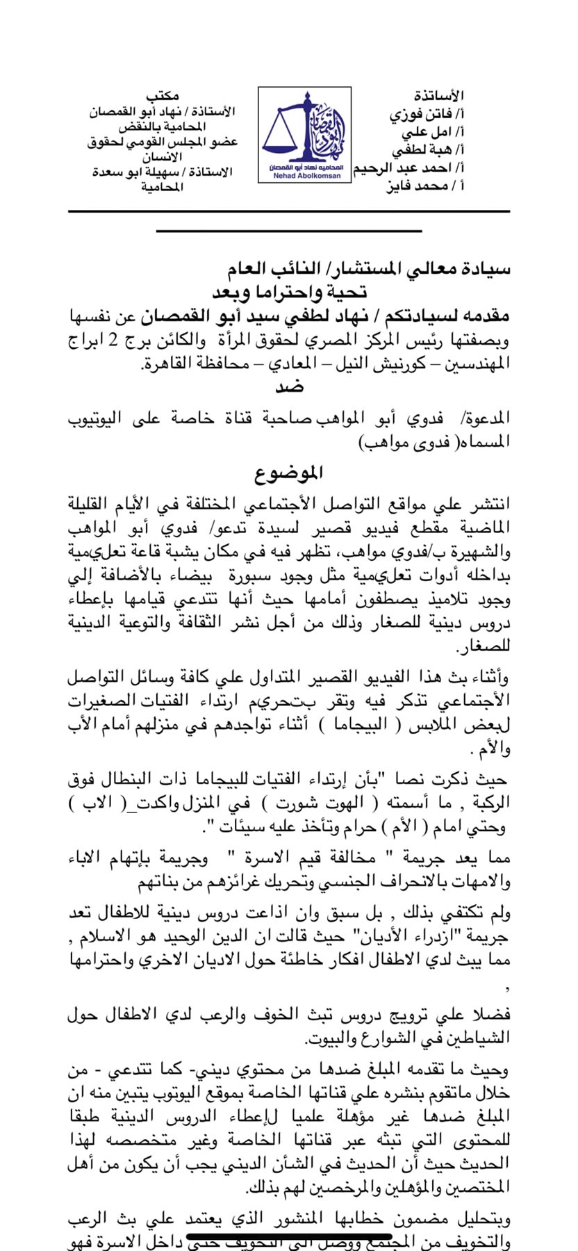 قالت نهاد أبو القمصان، في بيان قدمته للنائب العام، إن المشكو في حقها ذكرت نصا "بأن ارتداء الفتيات للبيجاما ذات البنطال فوق الركبة، ما اسمته (الهوت شورت) في المنزل، مما يعد جريمة "مخالفة قيم الأسرة" وجريمة باتهام الآباء والأمهات بالانحراف الجنسي وتحريك غرائزهم من بناتهم، ولم تكتف بذلك، بل سبق وأن أذاعت دروسا دينية للأطفال تعد جريمة "ازدراء الأديان"، حيث قالت إن الدين الوحيد هو الإسلام، مما يبث لدى الأطفال أفكارا خاطئة حول الأديان الأخرى واحترامها، فضلا على ترويج دروس تبث الخوف والرعب لدى الأطفال حول الشياطين في الشوارع والبيوت.