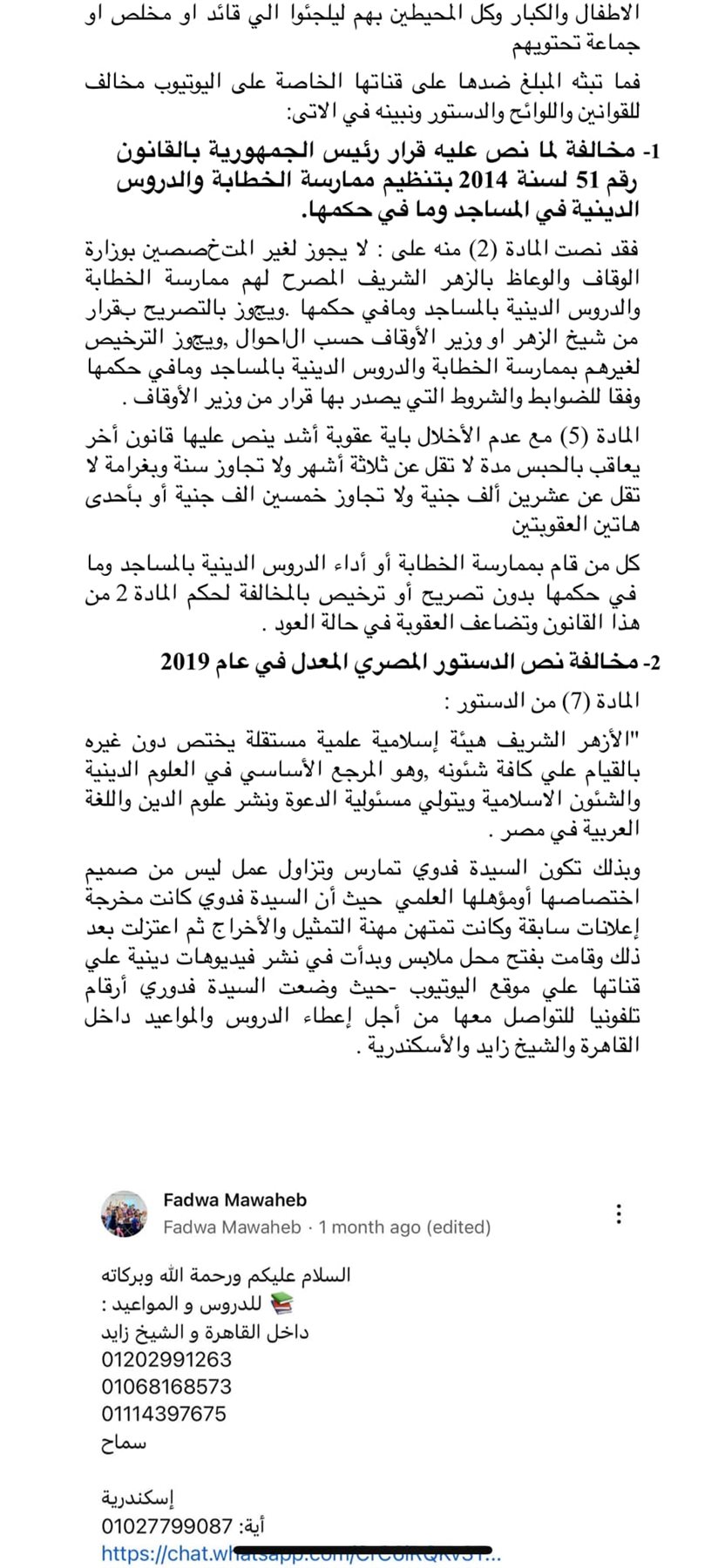 وتابعت أبو القمصان :" ما تقدمه المبلغ ضدها من محتوي ديني- كما تتدعي - من خلال ما تقوم بنشره علي قناتها الخاصة بموقع اليوتيوب يتبين منه أن المبلغ ضدها غير مؤهلة علميا لإعطاء الدروس الدينية طبقا للمحتوى التي تبثه عبر قناتها الخاصة وغير متخصصة لهذا الحديث، حيث إن الحديث في الشأن الديني يجب أن يكون من أهل المختصين والمؤهلين والمرخصين لهم بذلك.
