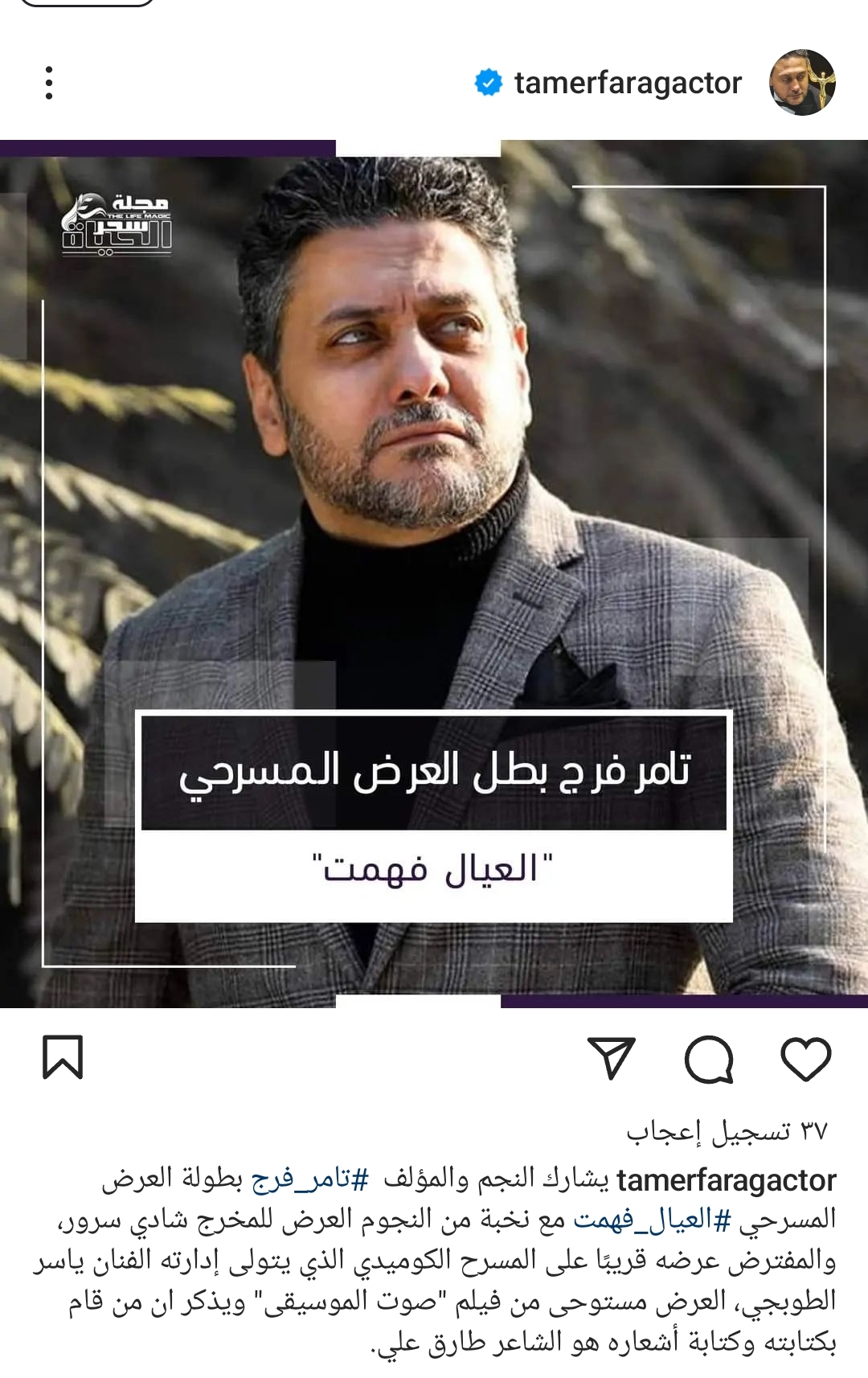 وروج الفنان تامر فرج للعرض المسرحي العيال فهمت، وذلك عبر حسابه الرسمي على موقع تبادل الصور والفيديوهات الشهير إنستجرام.