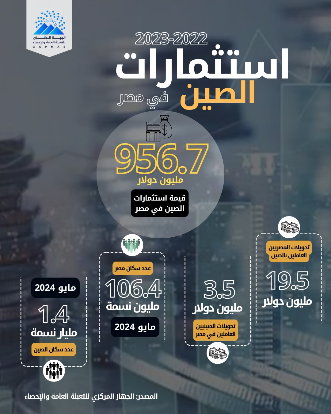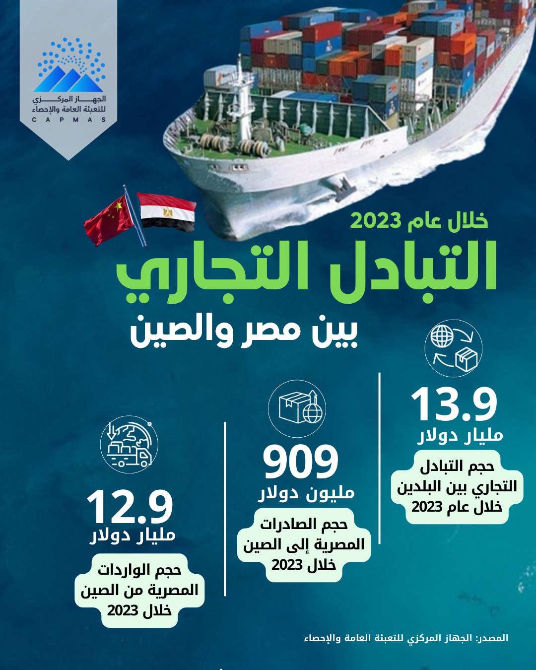 وفي ذات السياق، أعلن الجهاز المركزى للتعبئة العامة والإحصاء عن وصول حجم التبادل التجارى بين مصر والصين إلى 13.9 مليار دولار خلال عام 2023 مقابل 16.6 مليار دولار خلال عام 2022.