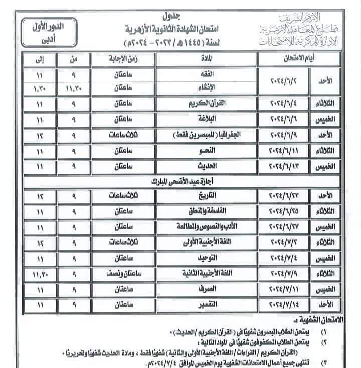 وأعلنت منطثة سوهاج الأزهرية، جداول امتحانات الدور الأول للشهادة الثانوية الأزهرية بقسميها العلمي والأدبي للعام الدراسي 2023 - 2024 .