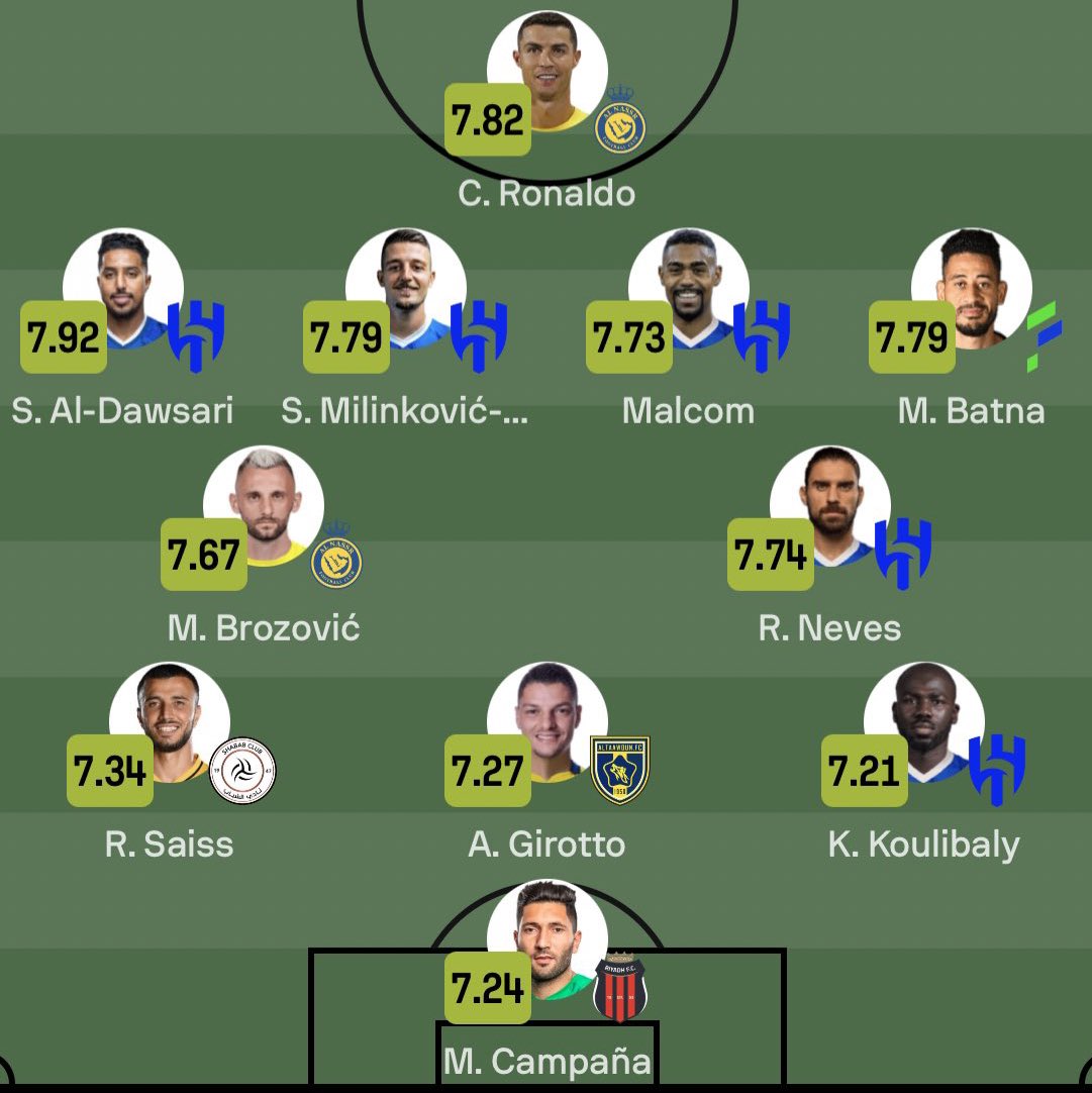الوسط الهجومي: مراد باتنا (الفتح)، مالكوم (الهلال)، سيرجي سافيتش (الهلال)، سالم الدوسري (الهلال)