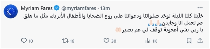 كتبت ميريام فارس عبر حسابها في موقع "إكس": "خلّينا كلنا الليلة نوحّد صلواتنا ودعواتنا على روح الضحايا والأطفال الأبرياء، مثل ما هلق عم نعمل انا وجايدن. يا ربي بشي أعجوبة توقّف لي عم بصير".