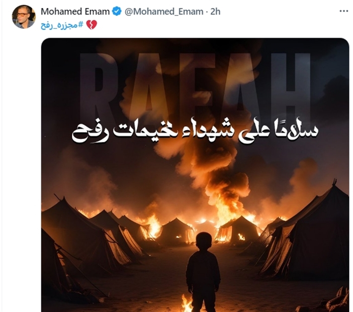نشر محمد إمام صورة لطفل يقف أمام خيام مشتعلة، وحملت الصورة جملة: "سلاما على شهداء رفح".