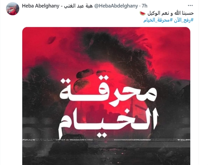 ونشرت هبة عبد الغني صورة لخيمة مشتعلة، وكتبت عليها "محرقة الخيام"، وكتبت في التعليق: حسبنا الله ونعم الوكيل"