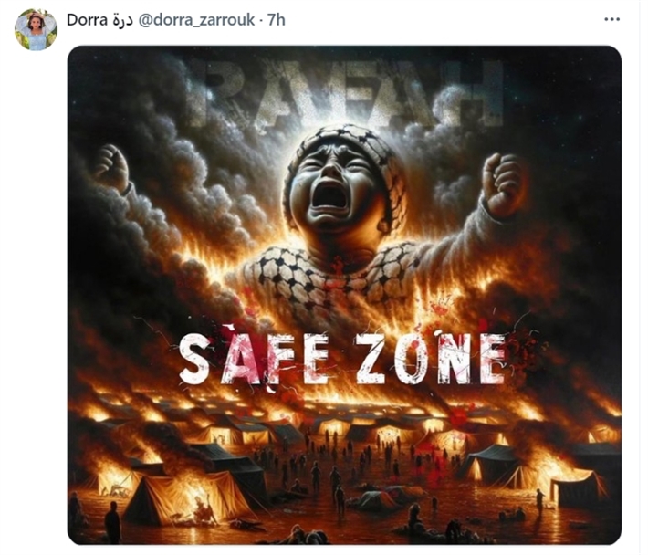 ونشرت درة صورة لطفل يبكي وخيام مشتعلة، وكتب على الصورة تعليق "منطقة آمنة".