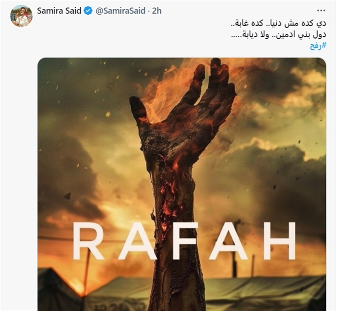 أما سميرة سعيد، فنشرت صورة تعبيرية ليد تستغيث من وسط النيران كتبت عليها كلمة "رفح"، وأضافت في التعليق: "دي كده مش دنيا.. كده غابة..دول بني ادمين.. ولا ديابة"
