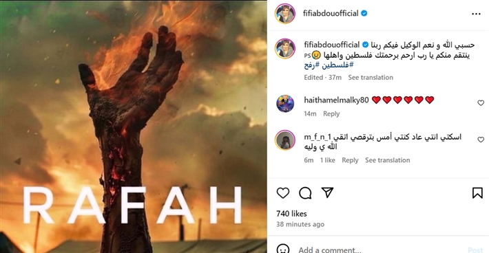 وكتبت فيفي عبده عبر إنستجرم: "حسبي الله و نعم الوكيل فيكم ربنا ينتقم منكم يا رب ارحم برحمتك فلسطين واهلها".