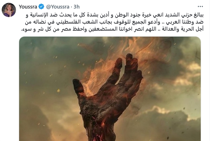 وكتبت النجمة يسرا: "ببالغ حزني الشديد انعي خيرة جنود الوطن و أدين بشدة كل ما يحدث ضد الإنسانية و ضد وطننا العربي .. وأدعو الجميع للوقوف بجانب الشعب الفلسطيني في نضاله من أجل الحرية والعدالة .. اللهم انصر اخواننا المستضعفين واحفظ مصر من كل شر و سوء".