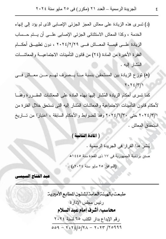 نشرت الجريدة الرسمية قرار الرئيس عبد الفتاح السيسى، رقم 183 لسنة 2024، بزيادة المعاشات اعتبارًا من 1-3-2024 بنسبة 15%.