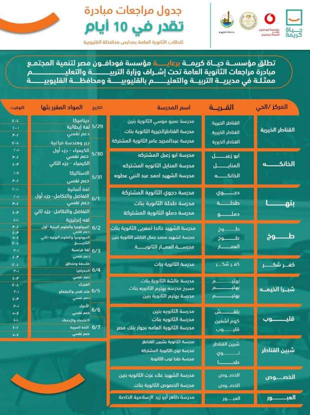 أعلنت مؤسسة حياة كريمة بالقليوبية جدول مراجعات لطلاب الثانوية العامة، تحت شعار “تقدر في 10 أيام”، وذلك تحت إشراف وزارة التربية والتعليم، وتستعرض" بوابة الوفد “ جدول مراجعات ”حياة كريمة" لطلاب الثانوية بالقليوبية، حيث تنطلق الفعاليات الأسبوع الجاري وحتى قبل الامتحانات في عدد من مدارس المحافظة.