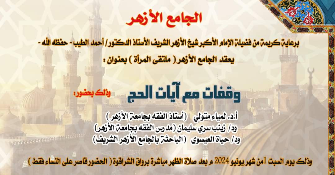 يعقد الجامع الأزهر الشريف السبت المقبل، الحلقة الأولى من الموسم الرابع عشر من برامجه الموجهة للمرأة والذي تحت عنوان "الحج أشهر معلومات"، وذلك برعاية الإمام الأكبر الدكتور أحمد الطيب، شيخ الأزهر الشريف، وبتوجيهات الدكتور محمد الضويني وكيل الأزهر، وبإشراف الدكتور عبد المنعم فؤاد، المشرف العام على الأنشطة العلمية للرواق الأزهري، والدكتور هاني عودة، مدير عام الجامع الأزهر.
