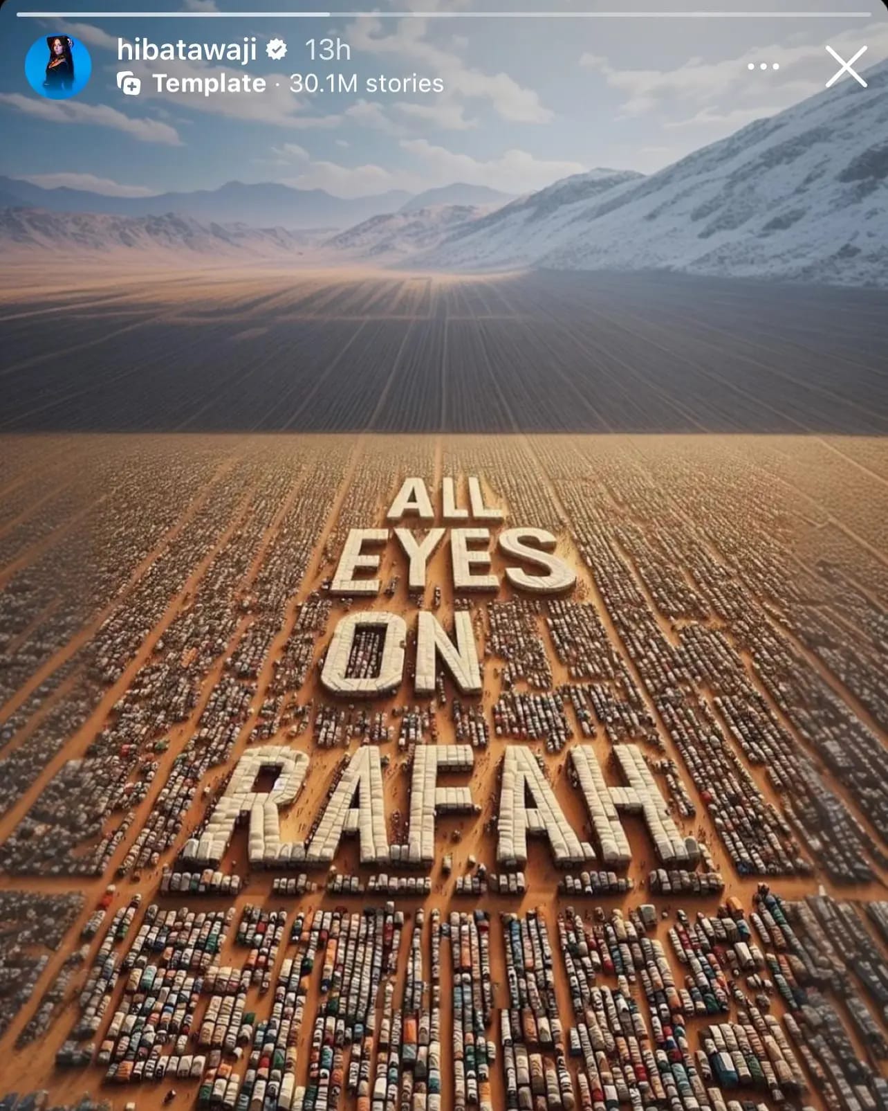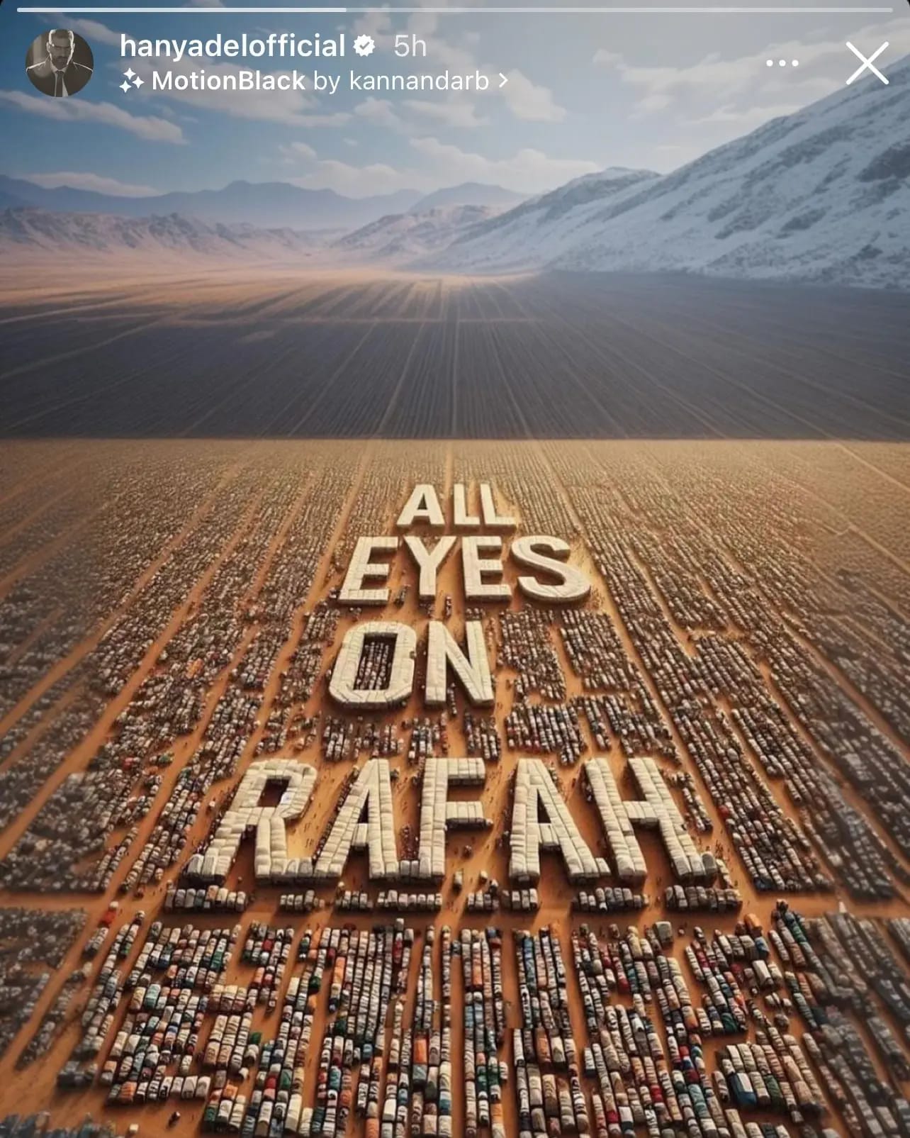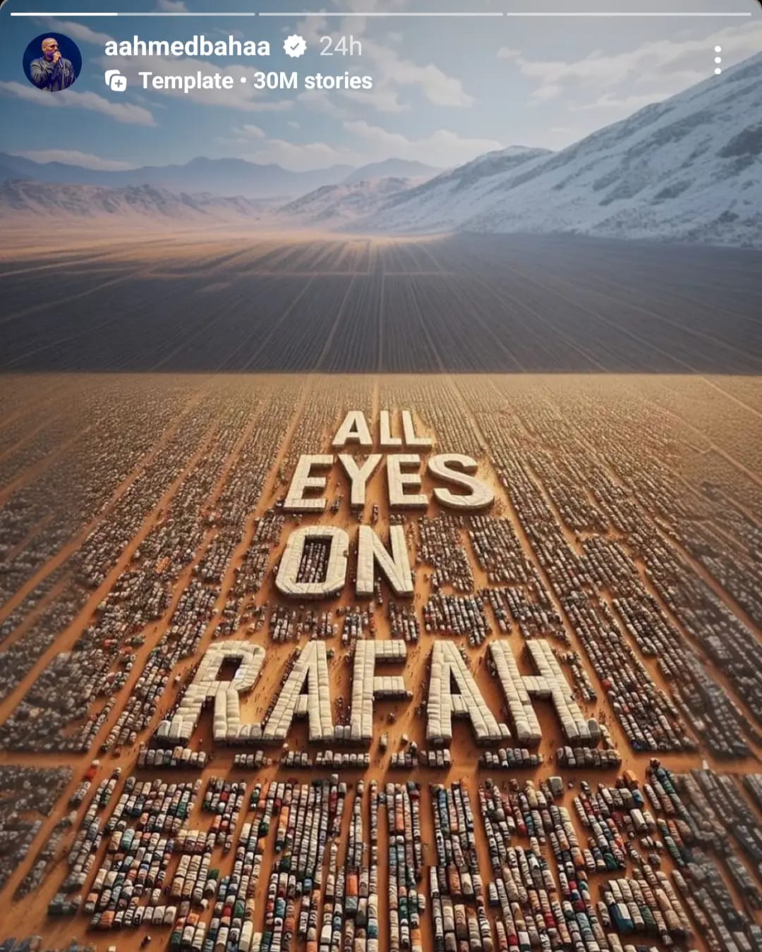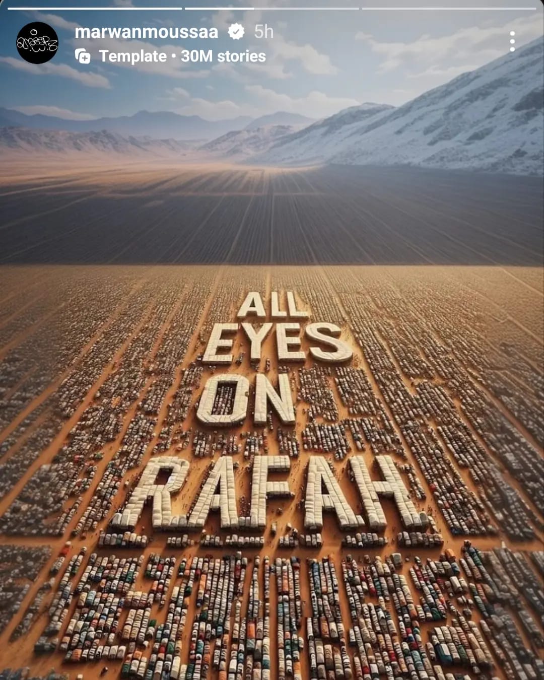 “كل العيون على رفح” لفتة إنسانية وتضامن عالمي غير مسبوق من نجوم الفن والرياضة ومشاعير الراب، بالتزامن مع الأحداث الدموية جراء مجزرة رفح التي عرفة إعلاميًا بـ “محرقة الخيام”.