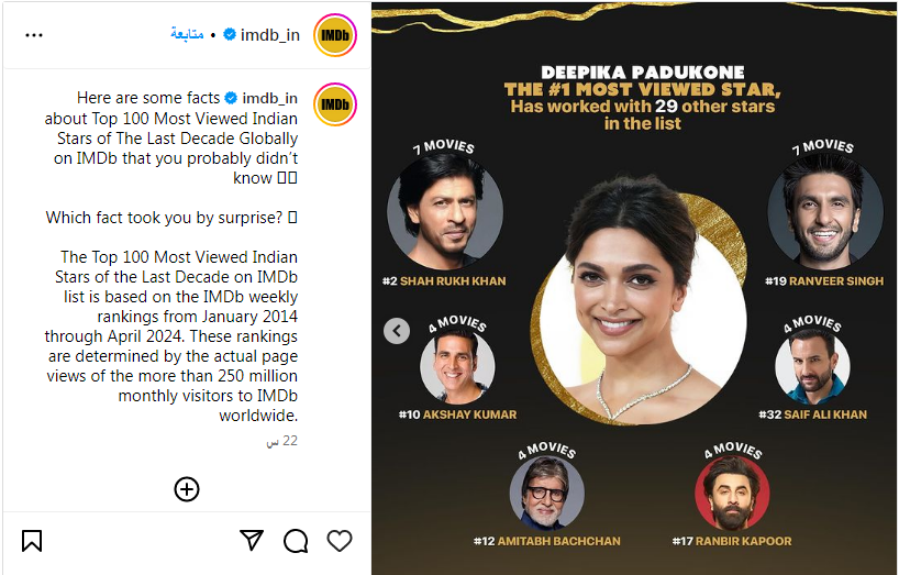 تفوقت الهندية ديبيكا بادكون على نجوم بوليوود، واحتلت المركز الأول، وضمت القائمة أكثر من 100 نجم هندي، وكان من بينهم النجم شاروخان، الذي احتل المرتبة الثانية، آيشواريا راي التي احتلت المرتبة الثالثة، عليا بهات بالمركز الرابع، وآخرون، وتأتي تحديد هذه التصنيفات من خلال مشاهدات الصفحة الفعلية لأكثر من 250 مليون زائر شهري لـ IMDb في جميع أنحاء العالم.