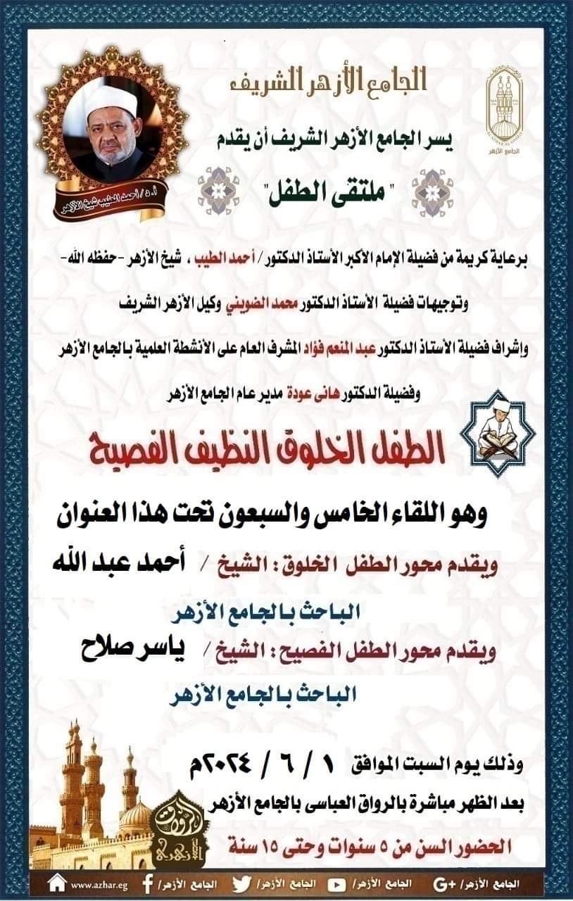 يواصل الجامع الأزهر الشريف السبت المقبل، عقد حلقة جديدة من ملتقى الطفل، والذي يأتي تحت عنوان: " الطفل الخلوق - النظيف - الفصيح"، وذلك تحت رعاية فضيلة الإمام الأكبر الأستاذ الدكتور أحمد الطيب شيخ الأزهر الشريف، وبمتابعة الدكتور محمد الضويني وكيل الأزهر الشريف، وإشراف الدكتور عبدالمنعم فؤاد، المشرف العام على الأنشطة العلمية للرواق الأزهري بالجامع الأزهر، والدكتور هاني عودة، مدير عام الجامع الأزهر الشريف.