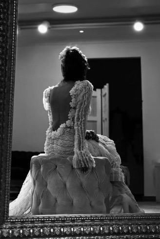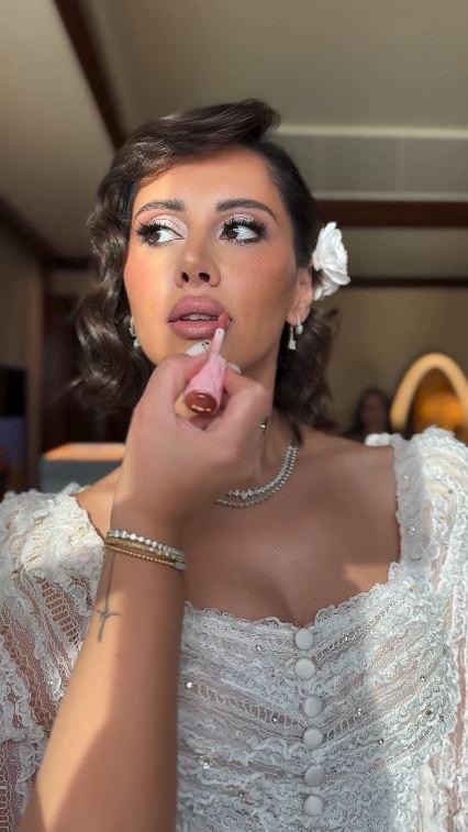 أطلت "ياسمين" بفستان زفاف مشغول من اللون الأبيض بالتل وزراير من نفس اللون بداية من الصدر حتى نهاية البطن، ومكياج هادئ من الألوان الترابية، وتسريحة تتناسب مع قصر شعرها، ووضعت وردة بيضاء على الجانب الأيسر.