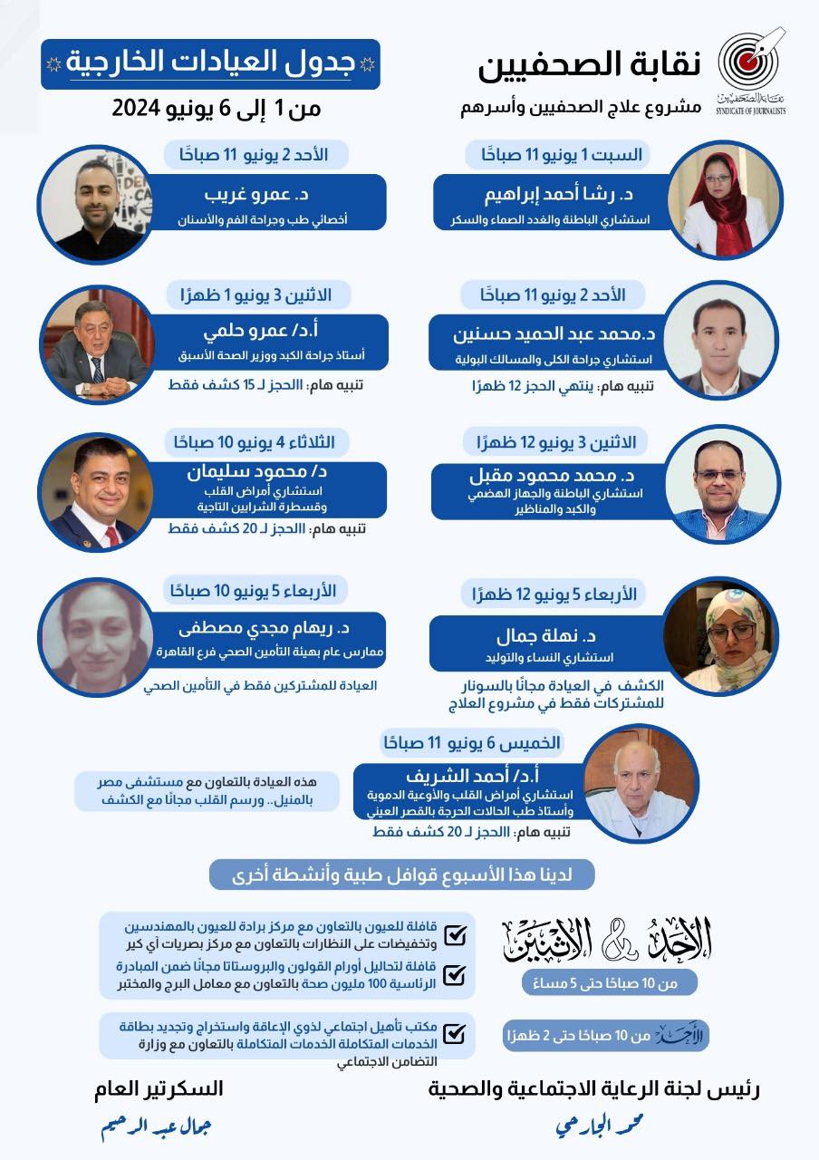 تعلن لجنة الرعاية الاجتماعية والصحية بنقابة الصحفيين، برئاسة محمد الجارحي، عضو مجلس النقابة، عن أسبوع طبي خلال الفترة من السبت 1 يونيو إلى الخميس 6 يونيو، ويشمل الأسبوع تنظيم عدد من القوافل والفعاليات الطبية، كما تعلن اللجنة عن جدول تشغيل العيادات الخارجية بالنقابة، بمشاركة 9 أطباء في التخصصات الطبية المختلفة.