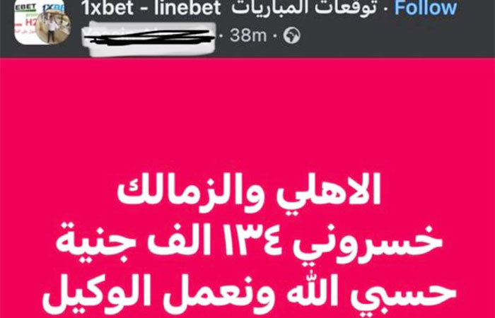 وأشار إسلام إلى أن سبب دخوله لهذا الموقع هو مجموعة من أصدقائه الذين يلعبون بشكل جماعى واقنعوه بالمراهنة بمبلغ صغير فى البداية نحو 500 جنيه، ولكن بعد فترة وجدت نفسى أراهن بمبالغ كبيرة بعدما ربحت نحو 3 آلاف جنيه فى 10 أيام، قائلاً: «كانت أكبر مكاسبى من الدورى المصرى والإنجليزى اللذين أتابعهما بشكل جيد»، وأضاف: بعد ذلك بدأت فى الرهان بمبلغ أكبر حتى خسرت نحو 15 ألف جنيه، وقررت التوقف عن المراهنة بعد 3 أشهر من اللعب عبر التطبيق.