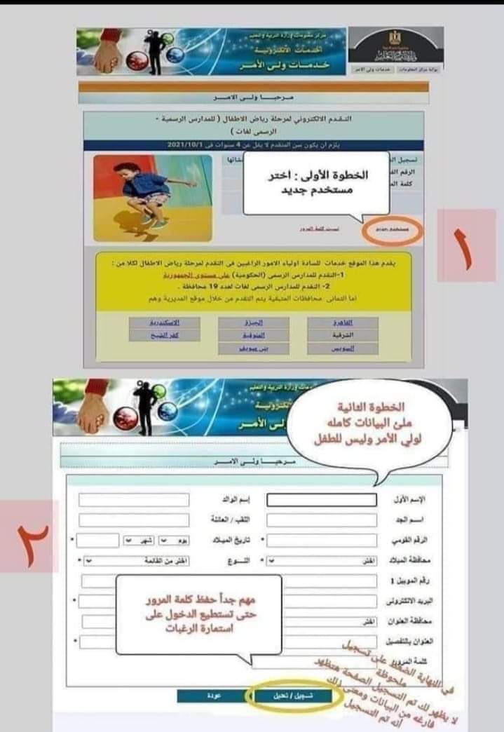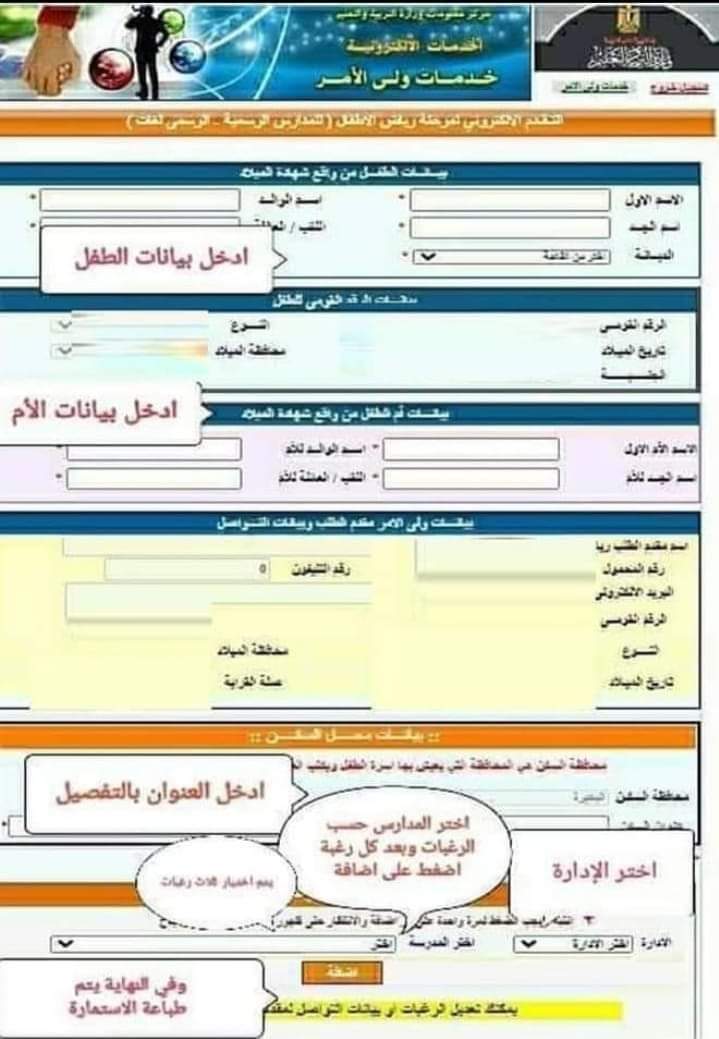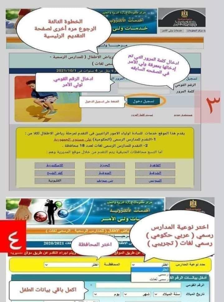 بالنسبة للمدارس الابتدائية ورياض الأطفال (رسمي) يمكن للمدارس في حالة عدم قدرة ولي الأمر على التسجيل الإلكترونى بنفسه، مساعدة ولي الأمر، بحيث يتولى مسئول وحدة المعلومات بالمدرسة القيام بتسجيل رغبة الطالب فى الالتحاق إلكترونياً بالمدرسة، من خلال التطبيق الإلكترونى المُعد للمدارس (التقدم للصف الأول الإبتدائي فقط)، ويلزم الاطلاع على شهادة الميلاد المميكنة للطفل المتقدم، وبطاقة الرقم القومى لولي الأمر، وفى حالة الولاية التعليمية يتم الإطلاع على الحكم القضائي، ويمكن للمدارس متابعة أعداد الطلاب المتقدمين إليها وبياناتهم خلال فترة التقدم.