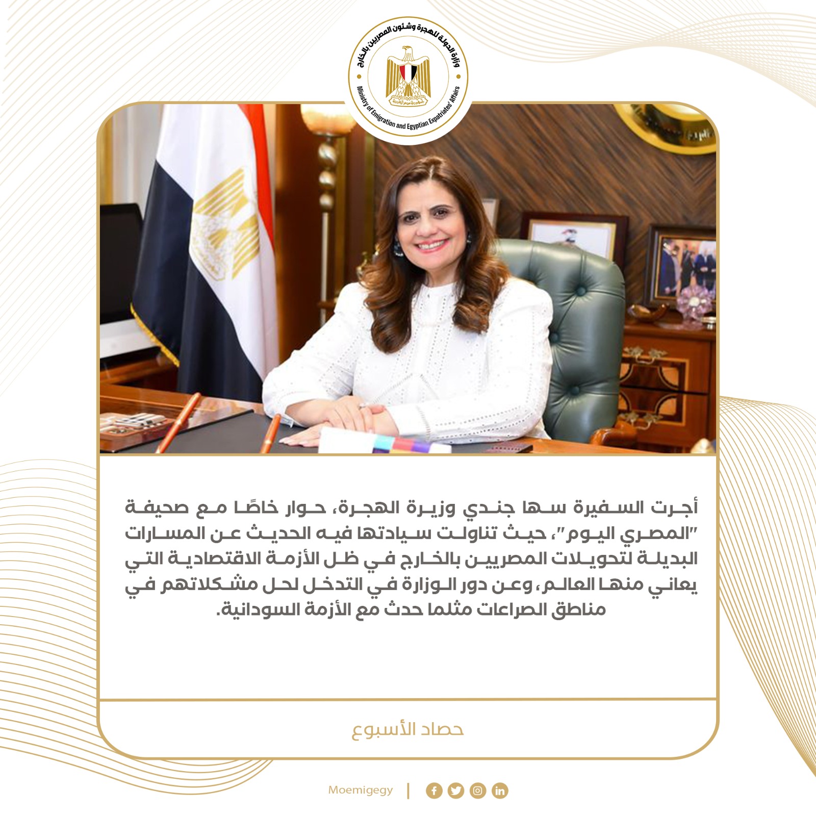 شهدت وزارة الهجرة نشاطا موسعا للوزيرة السفيرة سها جندي، على مدار أسبوع كامل؛ وخلال السطور التالية، نستعرض النشاط الكامل للسيدة وزيرة الهجرة كما يلي:
