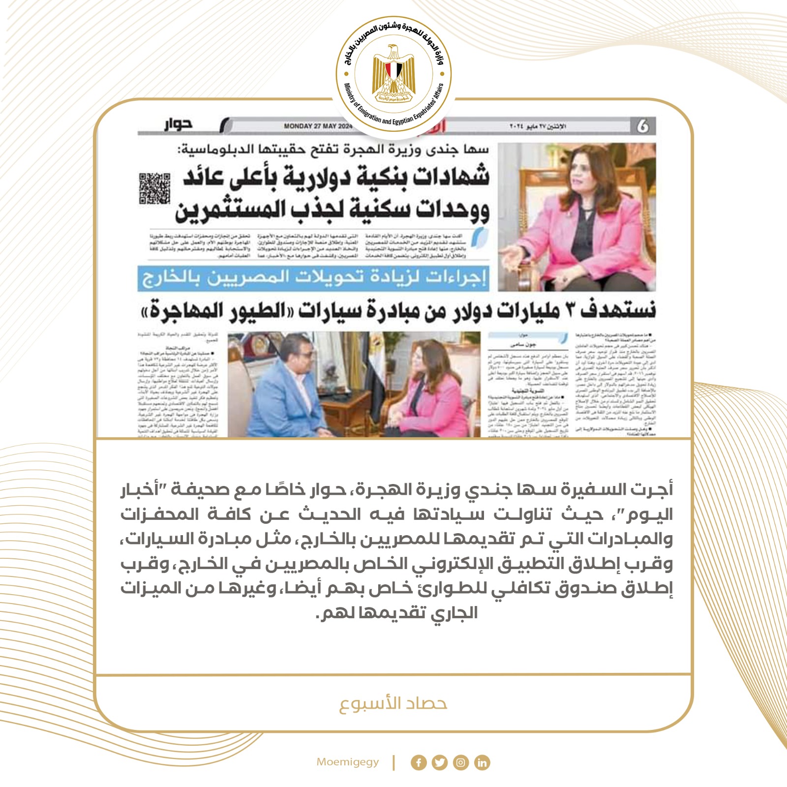 أجرت السفيرة سها جندي وزيرة الهجرة، حوار خاصًا مع صحيفة "أخبار اليوم"، حيث تناولت فيه الحديث عن كافة المحفزات والمبادرات التي تم تقديمها للمصريين بالخارج، مثل مبادرة السيارات، وقرب إطلاق التطبيق الإلكتروني الخاص بالمصريين في الخارج، وقرب إطلاق صندوق تكافلي للطوارئ خاص بهم أيضا، وغيرها من الميزات الجاري تقديمها لهم.