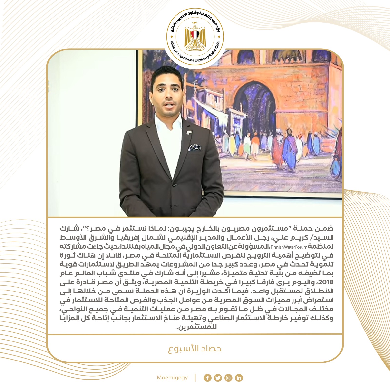 ضمن حملة "مستثمرون مصريون بالخارج يجيبون: لماذا نستثمر في مصر؟"، شارك كريم علي، رجل الأعمال والمدير الإقليمي لشمال إفريقيا والشرق الأوسط لمنظمة Finnish Water Forum، المسؤولة عن التعاون الدولي في مجال المياه بفنلندا، حيث جاءت مشاركته في لتوضيح أهمية الترويج للفرص الاستثمارية المتاحة في مصر، قائلا إن هناك ثورة تنموية تحدث في مصر، وعدد كبير جدا من المشروعات يمهد الطريق لاستثمارات قوية بما تضيفه من بنية تحتية متميزة، مشيرا إلى أنه شارك في منتدى شباب العالم عام 2018، واليوم يرى فارقا كبيرا في خريطة التنمية المصرية، ويثق أن مصر قادرة على الانطلاق لمستقبل واعد.